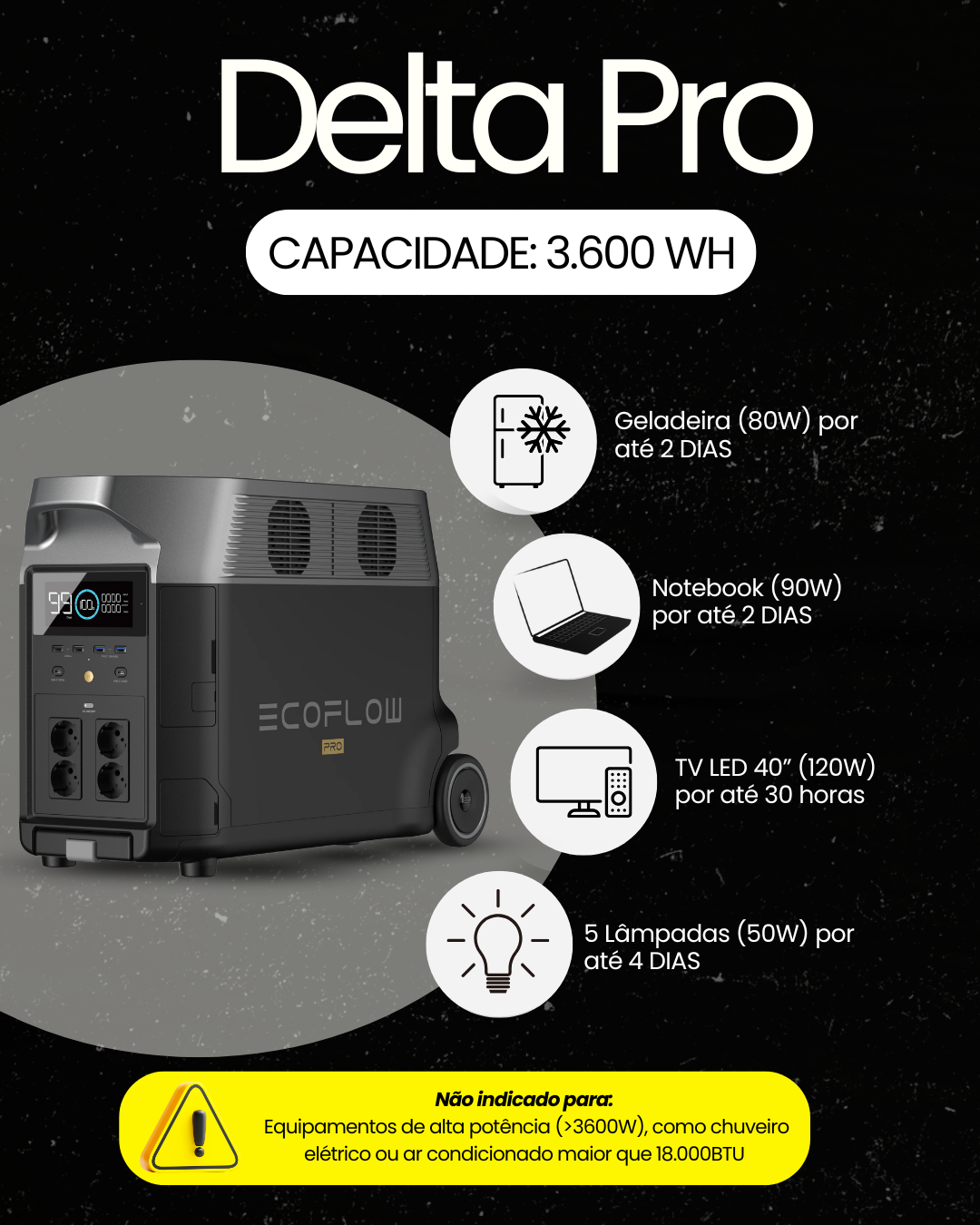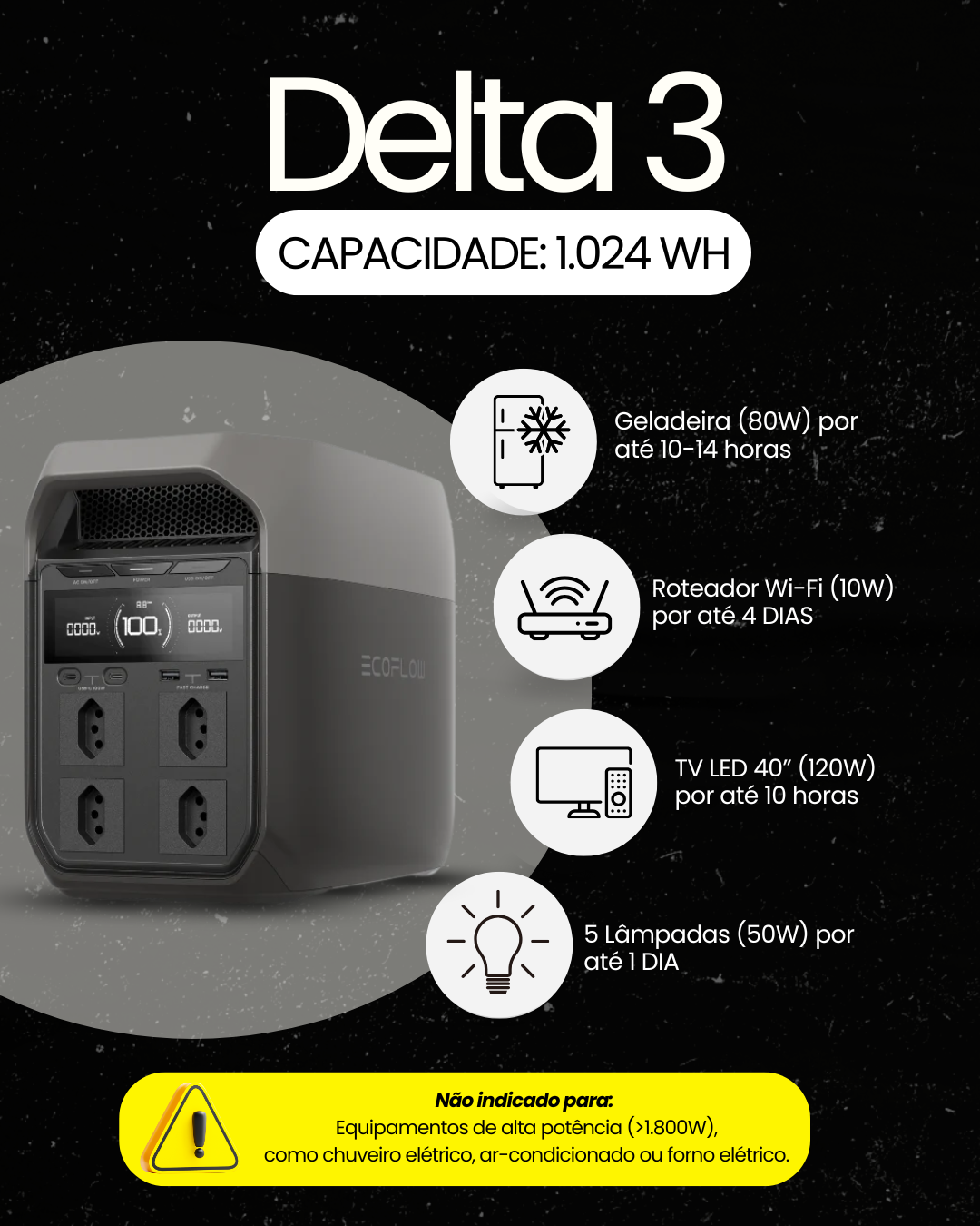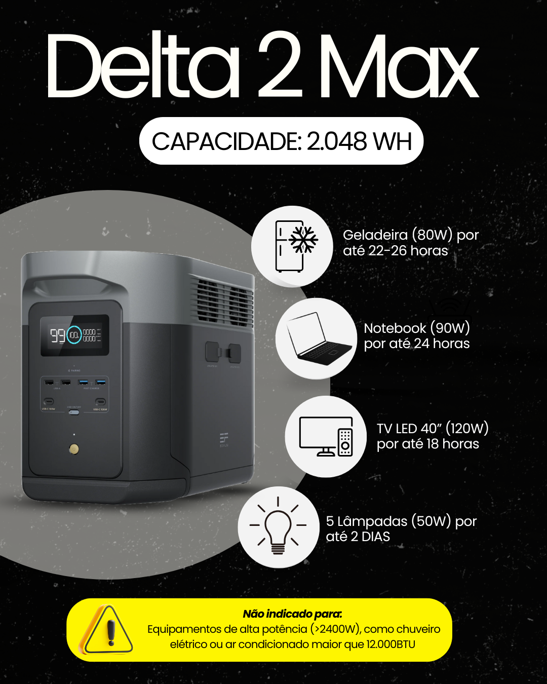 A mais robusta da linha. Com até 3.600W de potência (expansível), é capaz de sustentar toda a residência por longos períodos, incluindo ar-condicionado, micro-ondas e outros equipamentos de maior consumo.