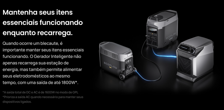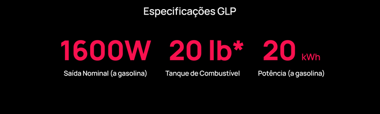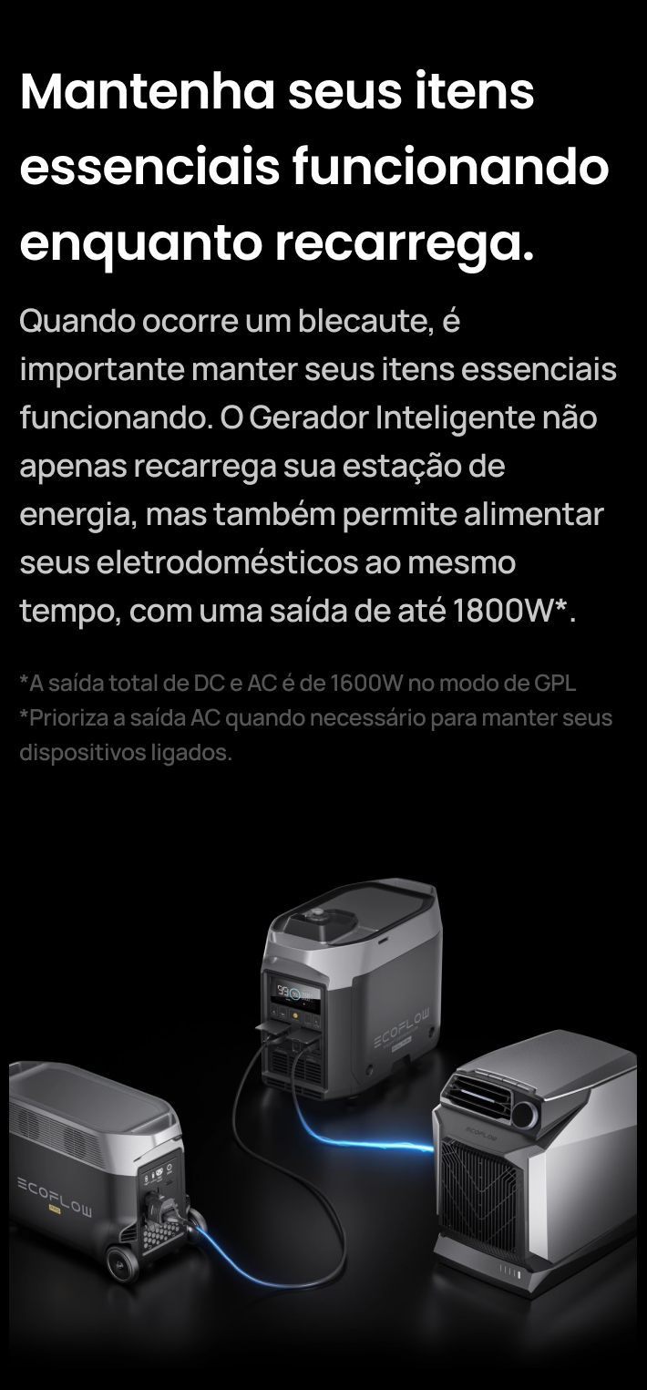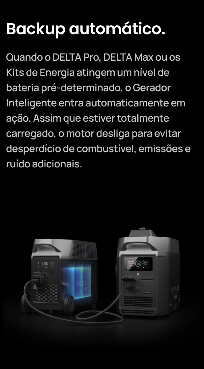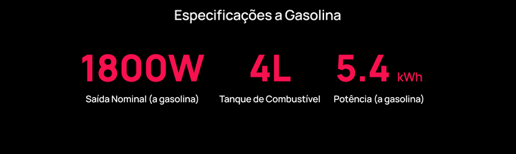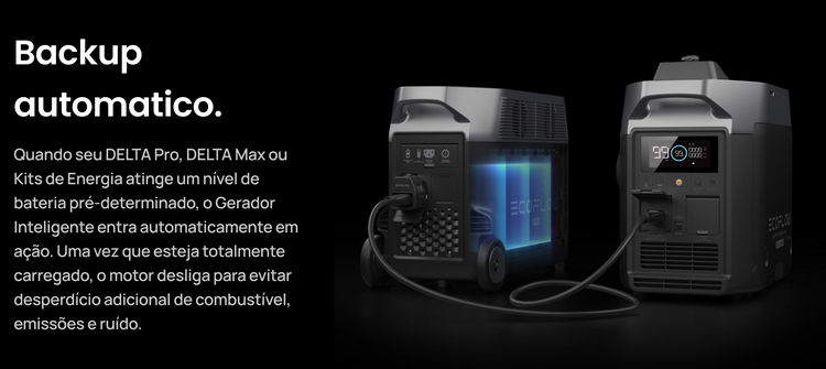 Com uma saída de 1600W-1800W1 e um tanque de gasolina de 4L, você pode gerar 5,4 kWh com gasolina ou até 20 kWh com GPL2. Isso proporciona até 12,5 horas de funcionamento apenas com GPL. Conecte isso ao seu DELTA Pro/Max para recarregar quando você ficar sem outras opções. Tudo isso usando menos combustível, produzindo menos ruído e gerando menos emissões.